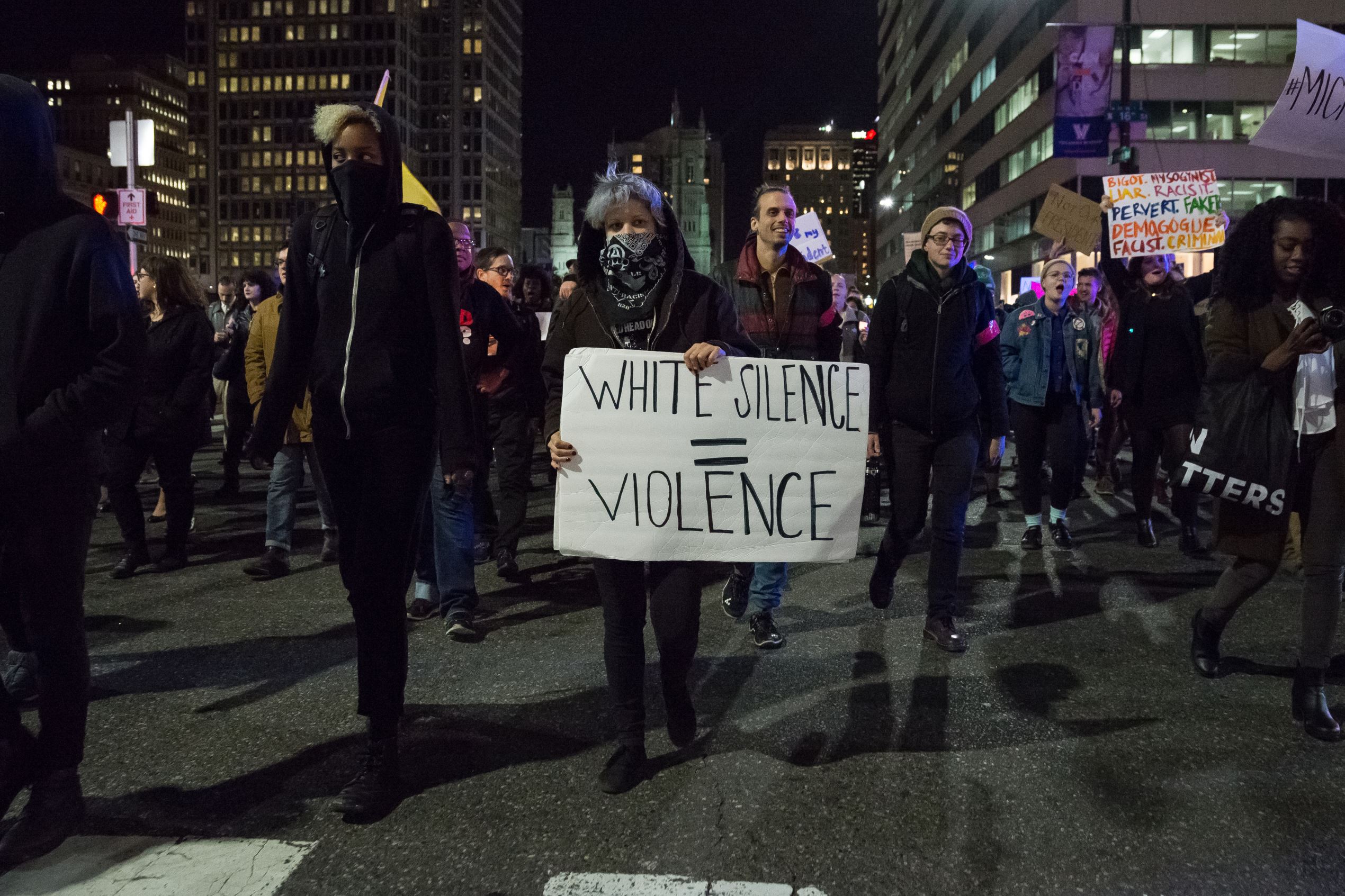 Two days after the U.S. presidential election, demonstrators staged a rally in downtown Philadelphia to object to the political agenda of President-elect Donald J. Trump.